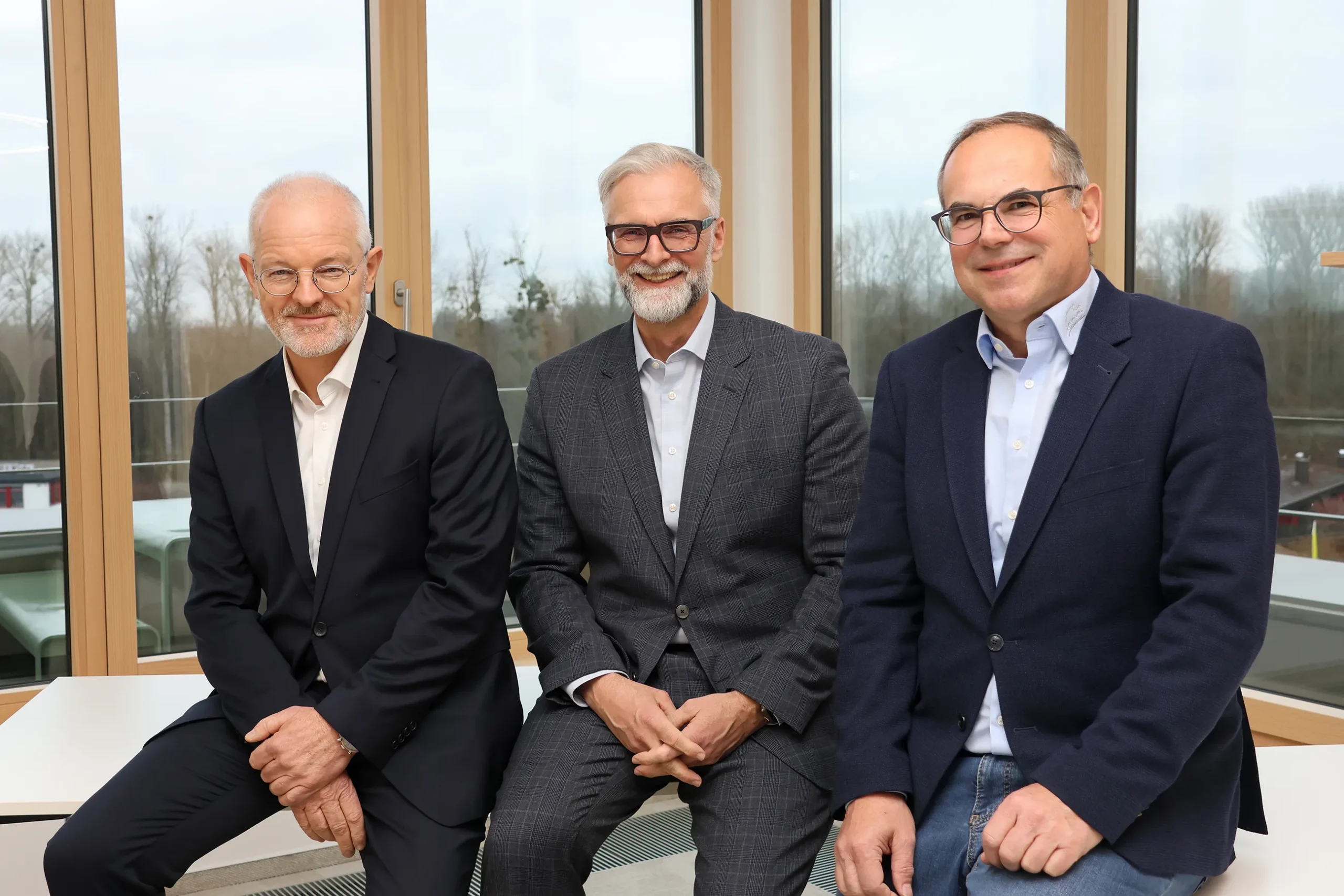 Die Geschäftsführer der Pneuhage Gruppe, Dr. Wolfgang Koppert (links) und Johannes Kuderer (Mitte) heißen zum Jahresauftakt 2026 Dr. Gerald Müller (Mitte) in der Gesamtgeschäftsführung für die Bereiche Personal, Organisation und Recht willkommen.